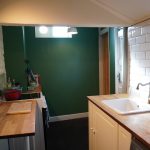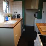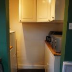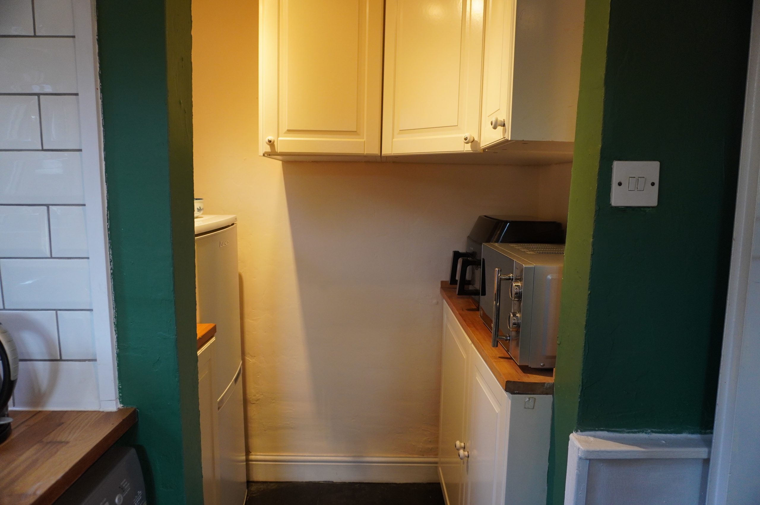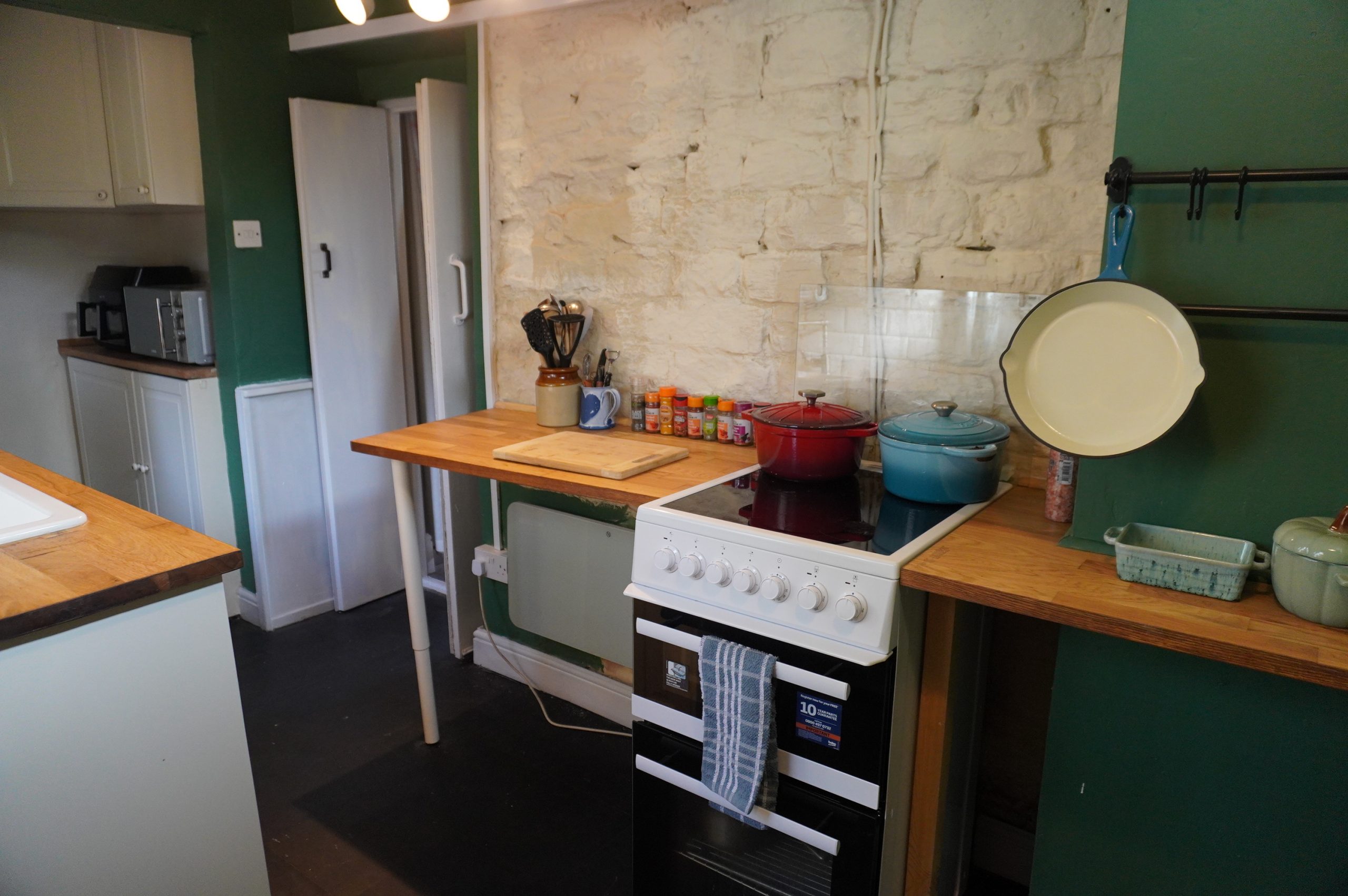 Fitted with wall and base units, inset sink with mixer tap, and space for a freestanding oven, washing machine and fridge freezer. There is also a wall mounted panel heater.