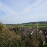 A well-presented bedroom featuring a charming fireplace and views over rooftops towards open fields beyond.