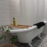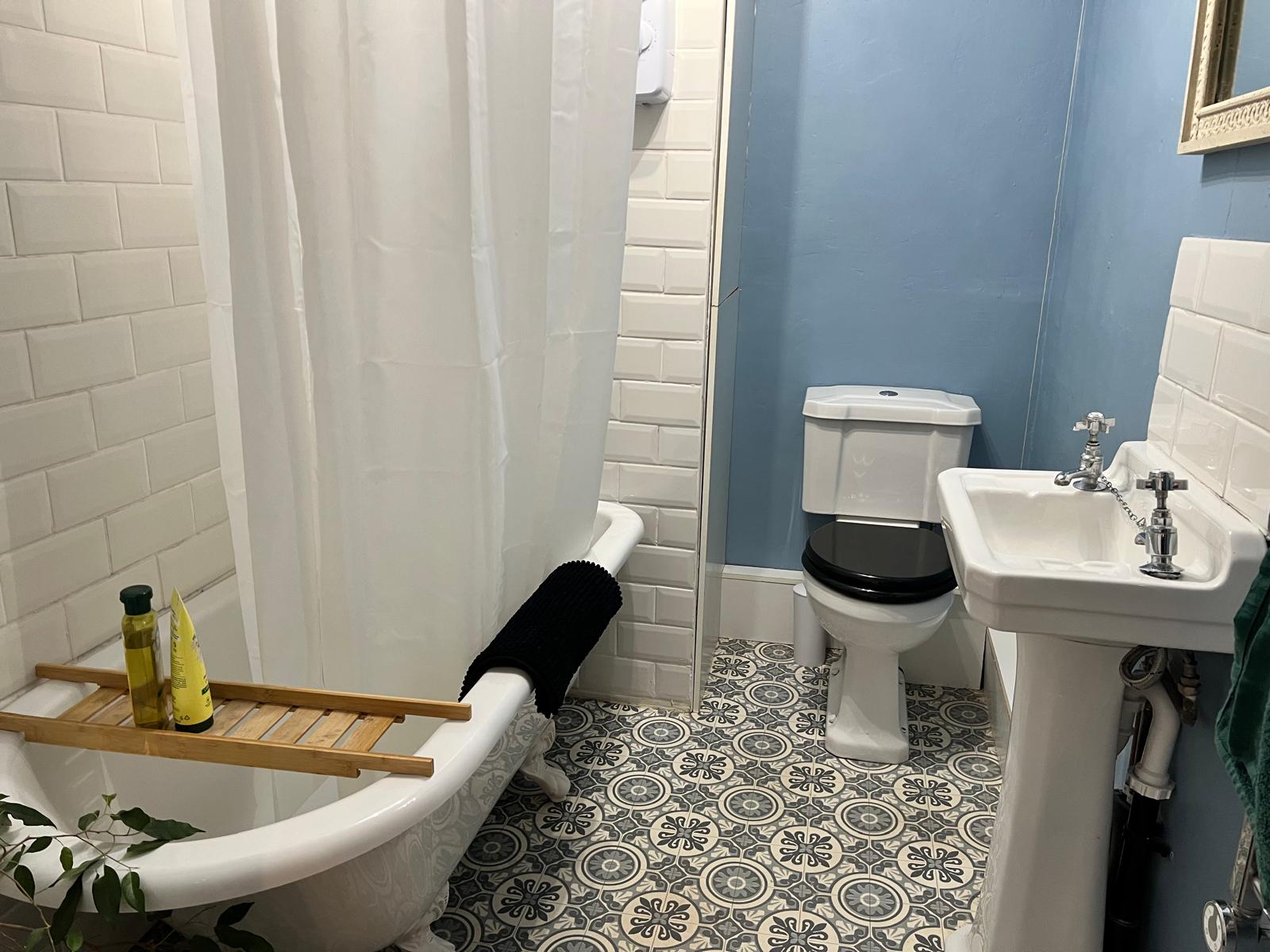 Charming bathroom featuring a white three-piece suite including pedestal wash basin, low flush WC and freestanding bath with shower over.