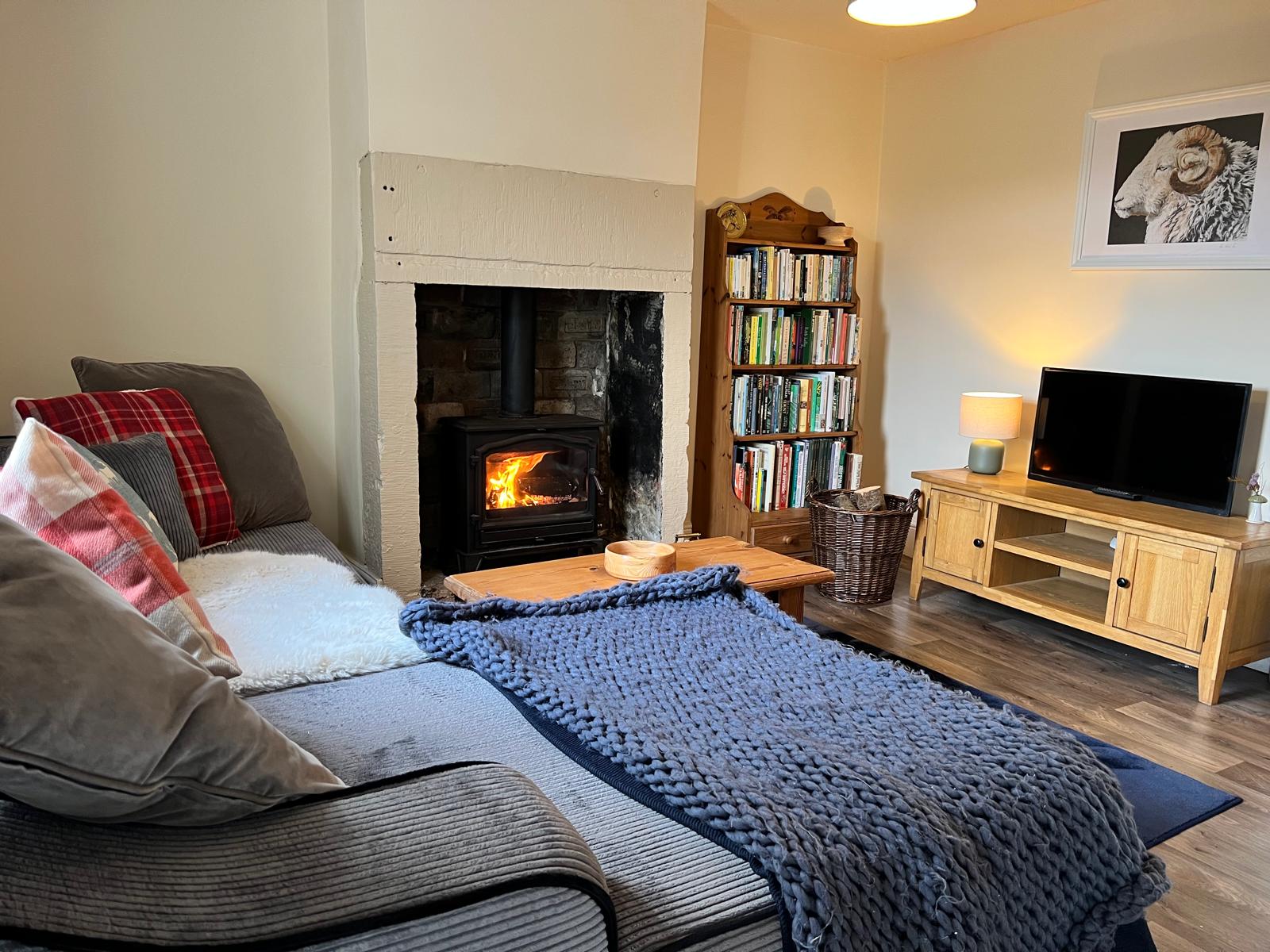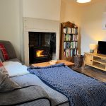 Cosy living room with a beautiful stone fireplace and log burner, creating a real focal point.