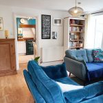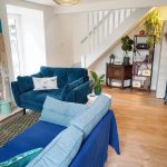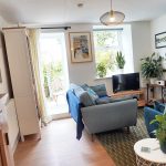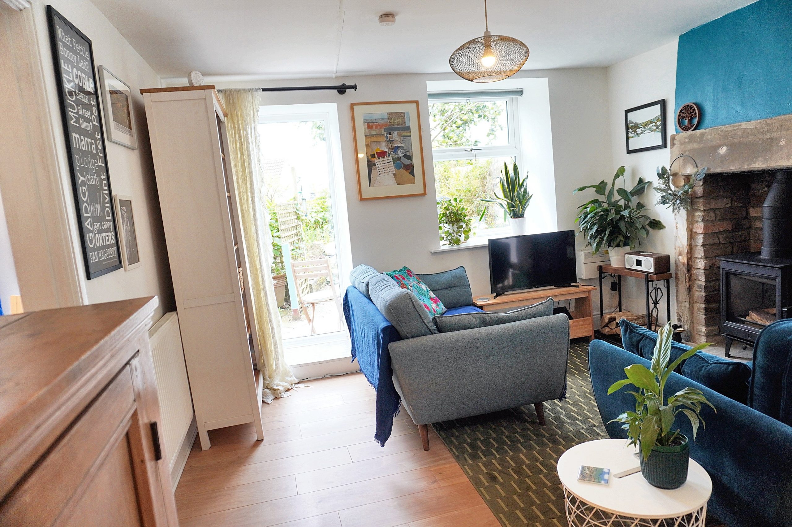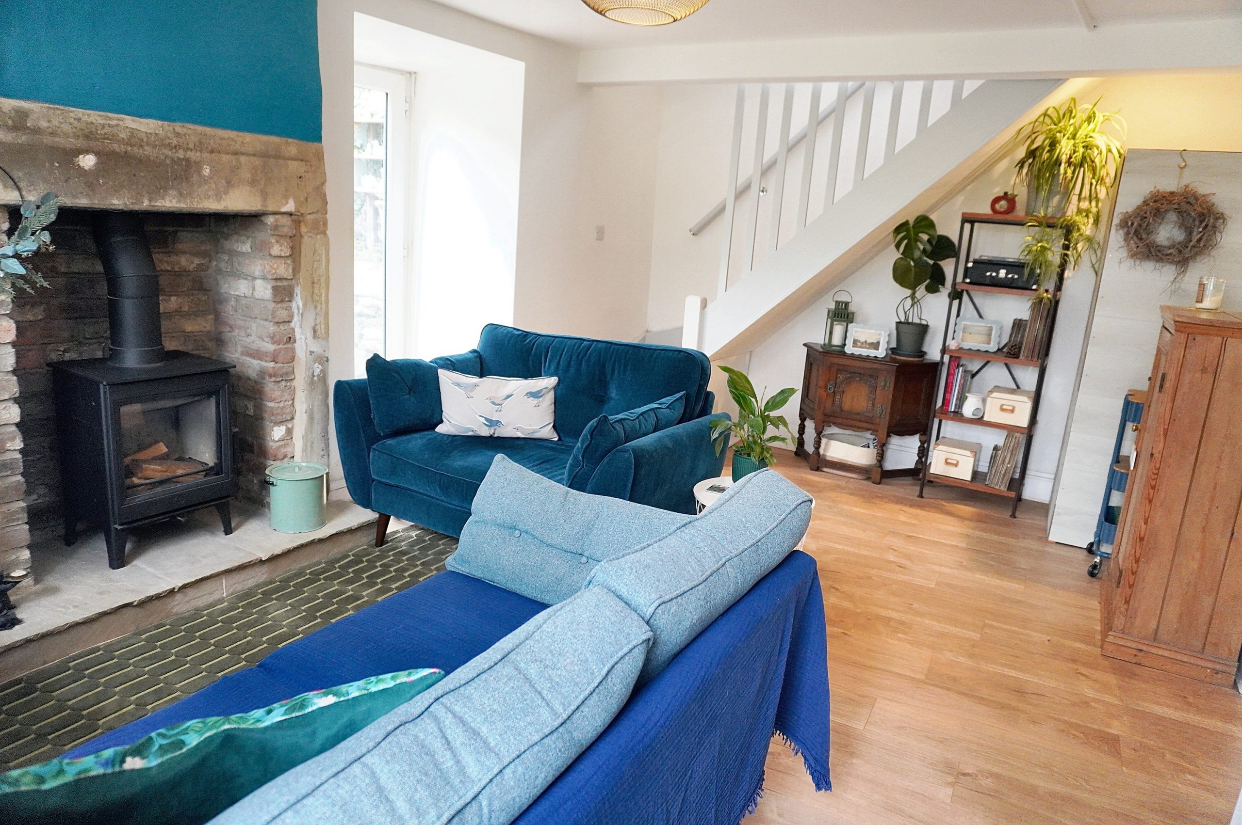 The living room provides is a true blend of comfort and character. A feature fireplace with exposed brickwork houses a wood-burning stove, the perfect spot to gather on cooler evenings. French doors open straight out into the side garden, letting in natural light and creating that easy flow between inside and out. Fresh décor and wood-effect flooring laminate keep the space bright and contemporary, while the log burner and rustic mantle nod to the cottage’s heritage. There’s ample room here for two sofas and a reading nook, making it just as suited to quiet evenings in front of the fire as it is to entertaining friends with the doors open on a summer’s day.