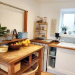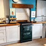 At the heart of the room sits a traditional green AGA, framed by a rustic timber beam and exposed painted stonework, a real focal point that gives the space its cottage soul. Natural light pours in through the rear window, highlighting the soft tones and homely details, from the ceramic sink to the tiled splashbacks and timber shelving. Including spaces for washing machine and fridge freezer, this is truly a cottage kitchen for baking and family meals!