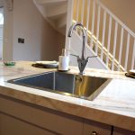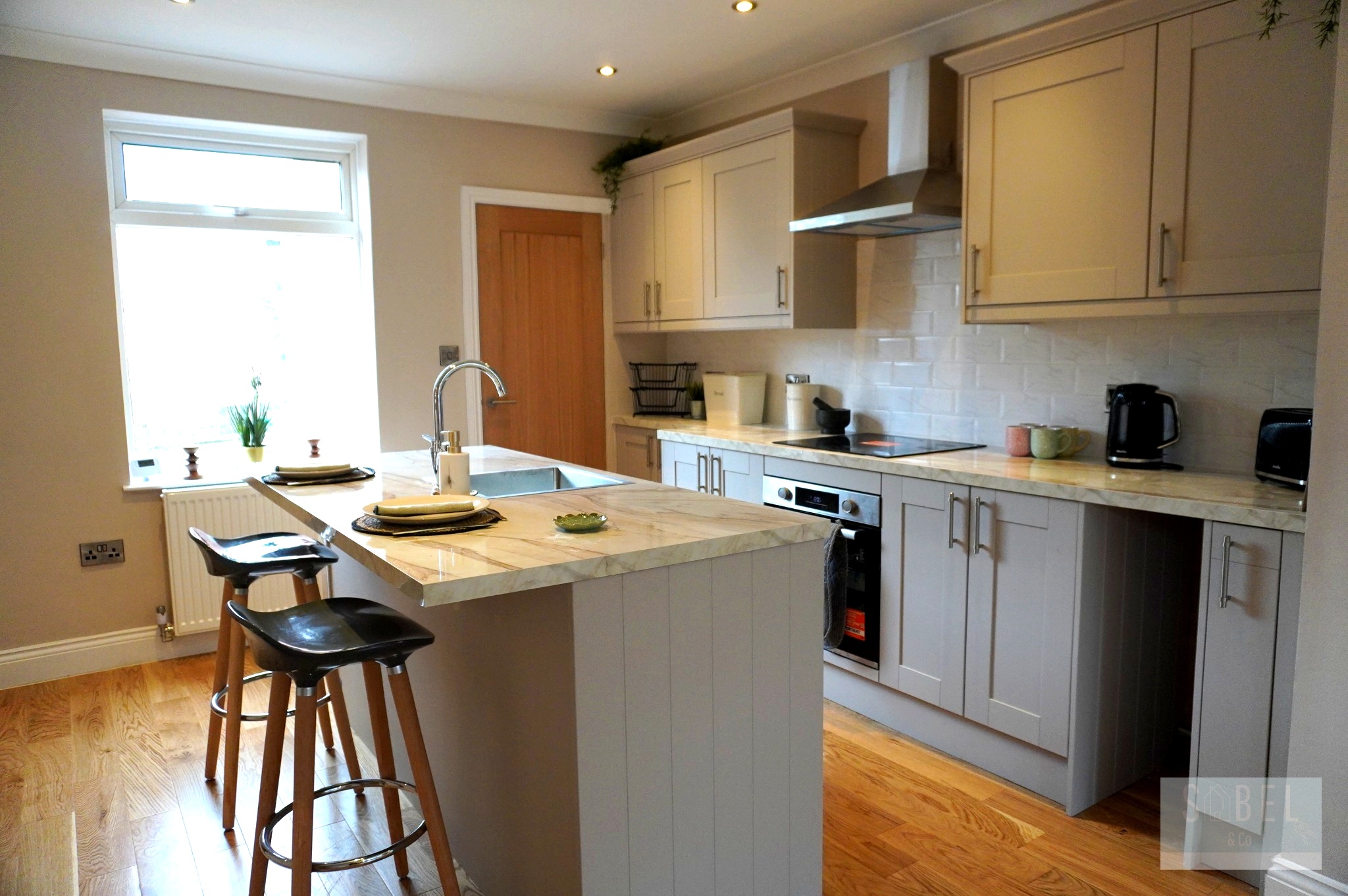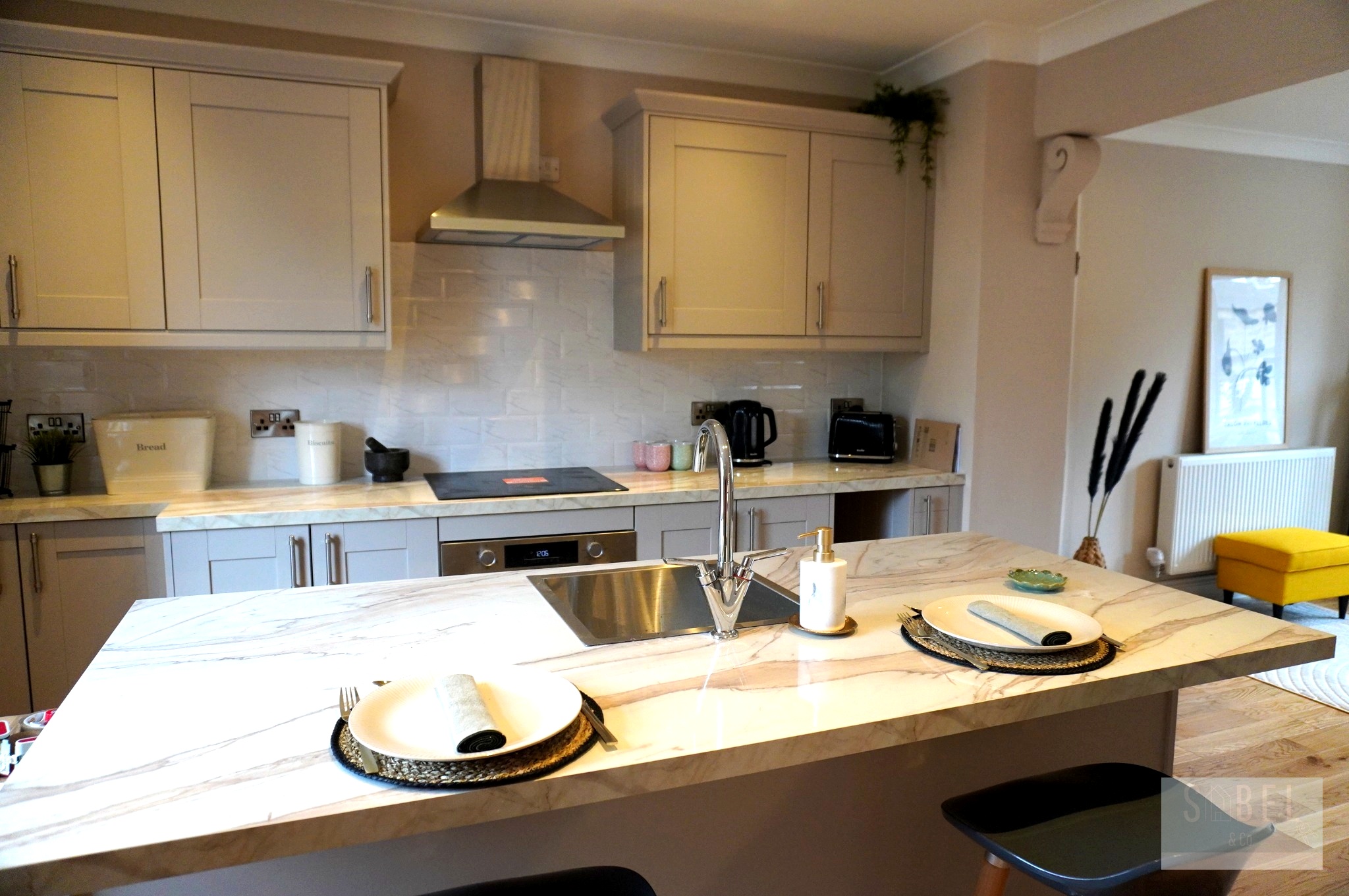 A beautifully appointed kitchen fitted with a range of wall and base units complemented by marble effect work surfaces and tiled splashback areas. The central island provides seating and incorporates an inset stainless steel sink with mixer tap, creating an ideal space for both everyday living and entertaining.
