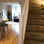 Stairs lead from the kitchen to the first floor, enhanced by natural light from a nearby window and complemented by feature LED inset strip lighting, adding a modern design touch.