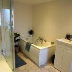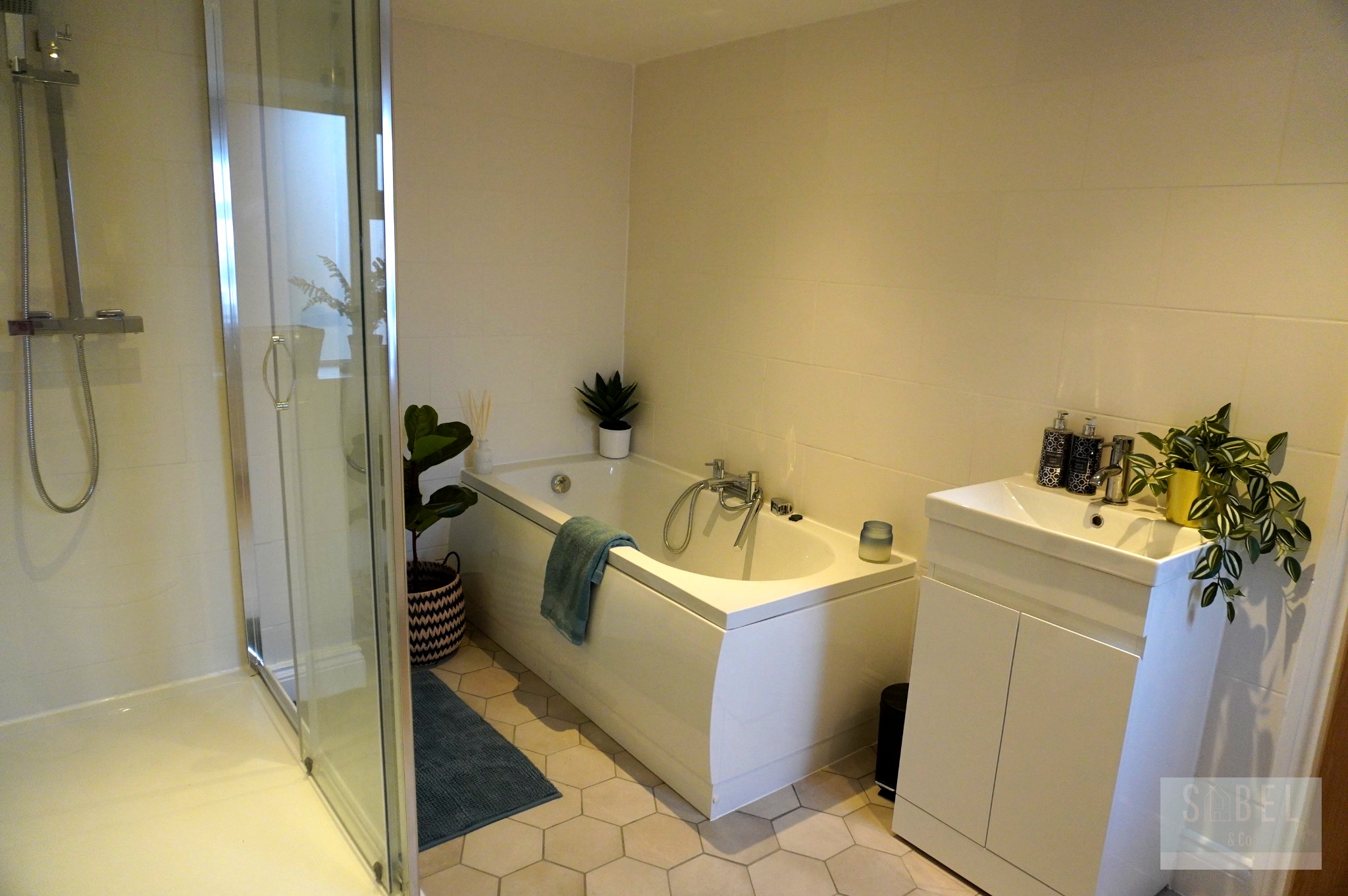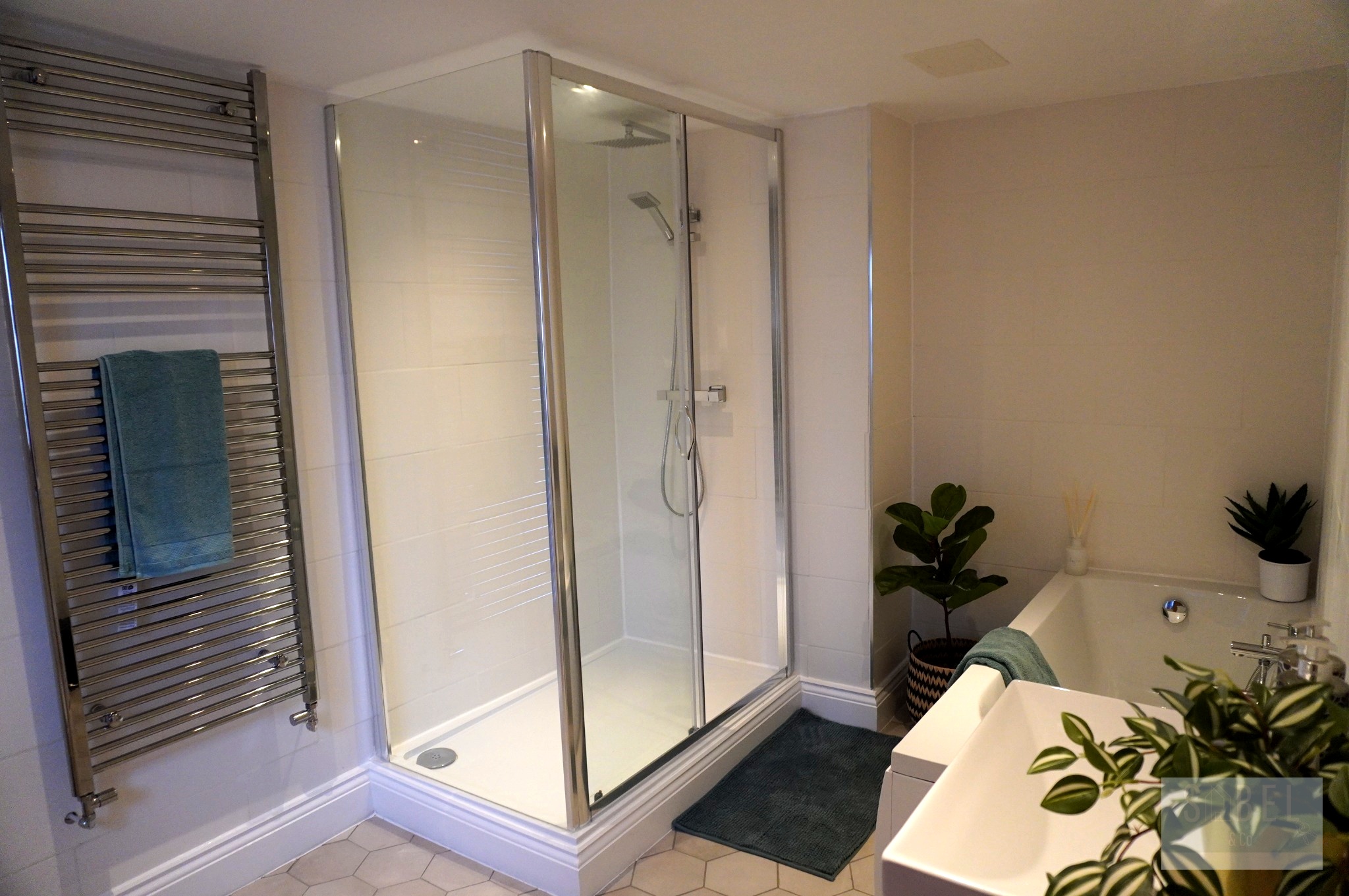 Spacious family bathroom comprising panelled bath with mixer tap and shower attachment, separate double shower cubicle with thermostatic shower, vanity unit with inset wash hand basin and mixer tap, and low flush WC. Complementary tiling to the walls and floor, heated towel rail and UPVC window to the rear elevation.