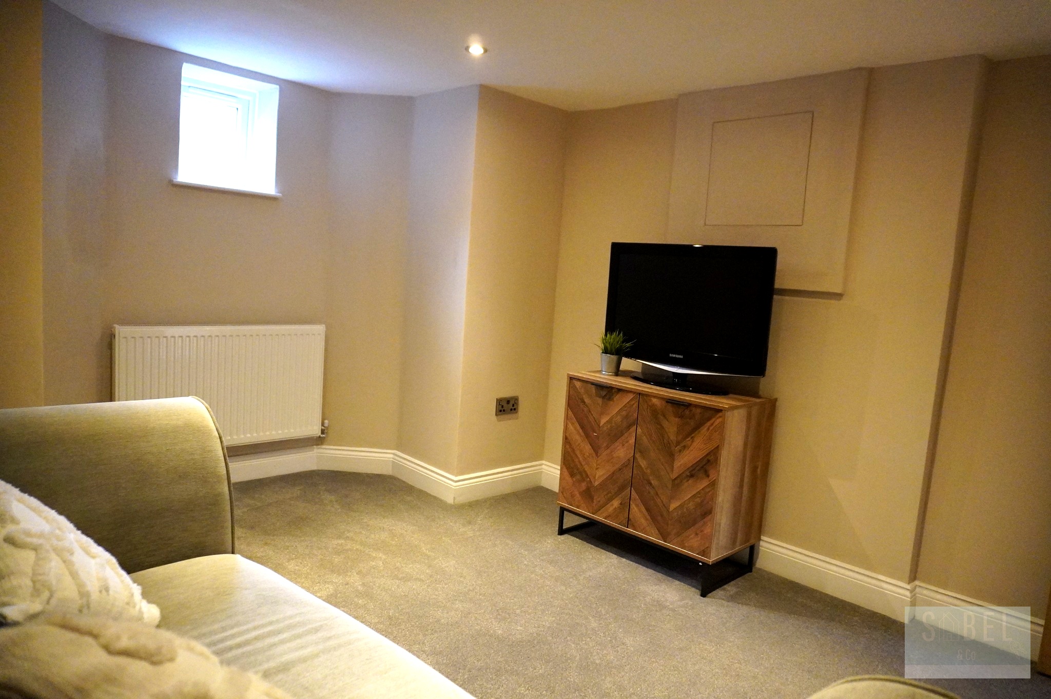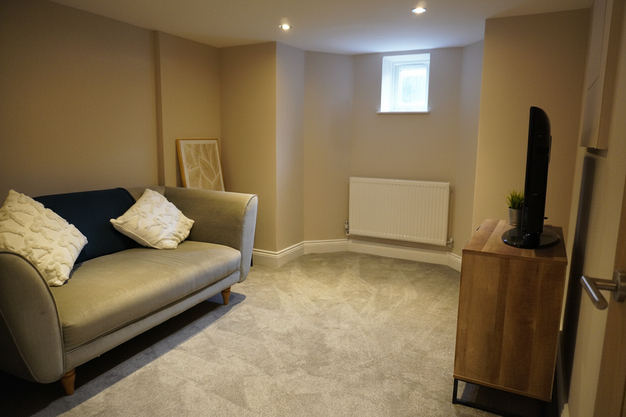 A versatile additional reception space currently arranged as a snug, featuring inset ceiling spotlights, central heating radiator and front elevation facing UPVC window providing natural light. An ideal cinema room, home office, hobby space or occasional guest area, with flexibility for a variety of uses subject to purchaser requirements.